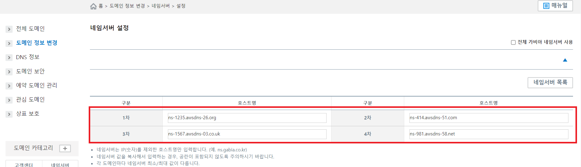 3. 가비아 해당 도메인 관리 - 도메인 정보 변경- 네임서버 설정으로 들어가서, route 53의 네임서버로 모두 바꿔준다.