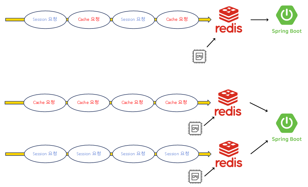 위 그림처럼 Redis를 분리하여 사용한다면 CPU 자원을 한 개 더 사용하여 세션 관련 요청과 캐시 관련 요청을 나눠서 처리한다면, 대기 시간이 줄어들고 처리 속도가 더 향상될 것이다.
