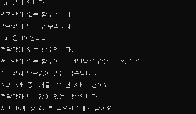 printf("사과 %d개 중 %d개를 먹으면 %d개가 남아요.\n\n", 10, 4, apple(10, 4)); //이런식으로 안에서 바로 함수호출 가능