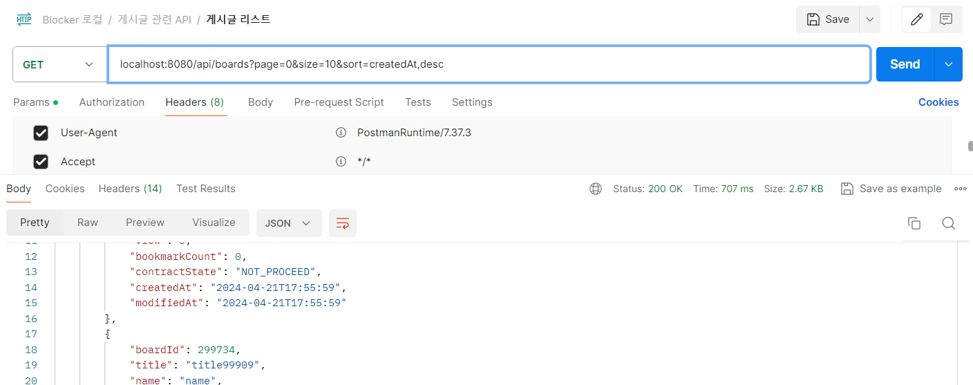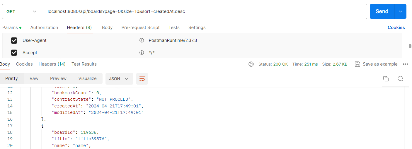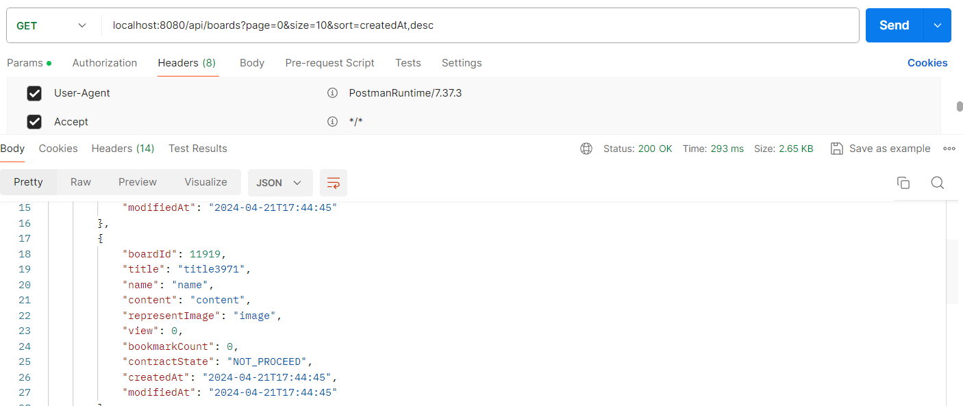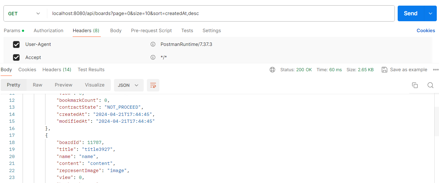 - 조회할 데이터는 메인 페이지의 게시글 리스트를 조회한다고 가정하여, /boards?page=0&sort=createdAt,desc&size=10으로 페이지 1, 게시글 10개, 최신순으로 조회합니다.