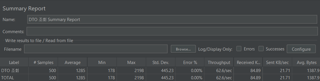 데이터의 양을 1/100로 줄였습니다. 엔티티 조회는 0.25초 정도 걸렸으며, DTO 조회는 0.06초로 빠른 응답 속도를 보여줍니다.