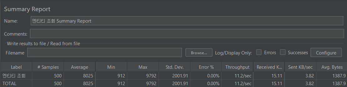 User, Contract, Board 각 데이터의 양을 1/2로 줄여도, 여전히 엔티티 조회는 13.59초가 나와 JMeter로는 테스트가 불가능 했습니다.