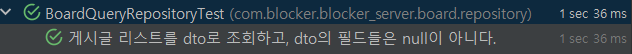 setUp()에서 30개의 Board를 저장했으며, DTO로 조회 시 모든 필드가 null이 아닌 것으로 테스트 했습니다.