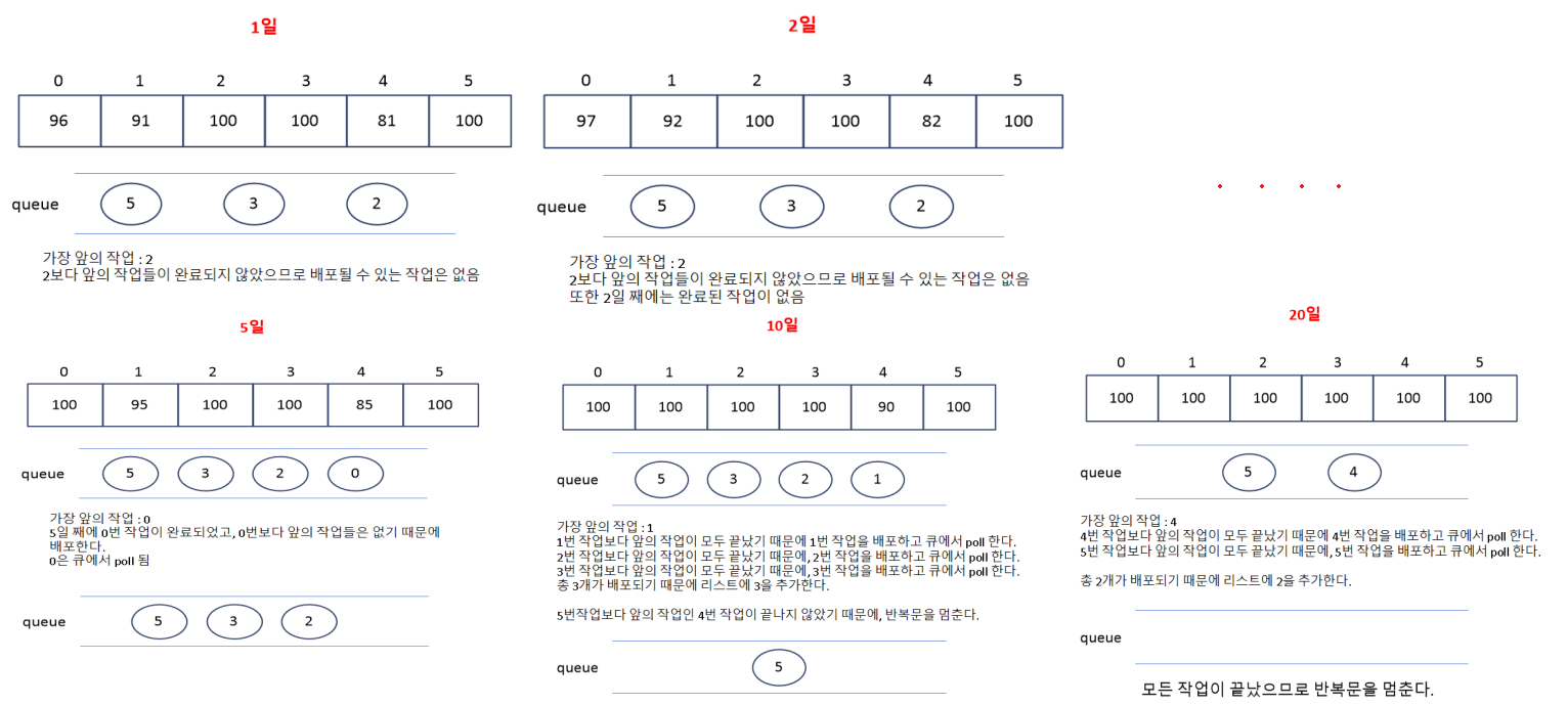 progresses[i] = 100; //진도를 높였을 때, 100 이상이면 큐에 작업의 인덱스를 추가해줌.