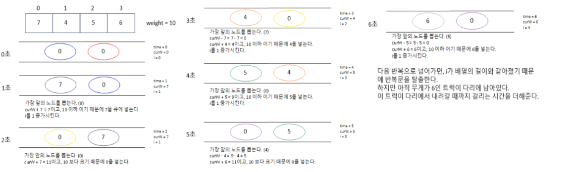 예를 들어, 트럭 2대가 올라갈 수 있고 무게를 10kg까지 견디는 다리가 있습니다. 무게가 [7, 4, 5, 6]kg인 트럭이 순서대로 최단 시간 안에 다리를 건너려면 다음과 같이 건너야 합니다.